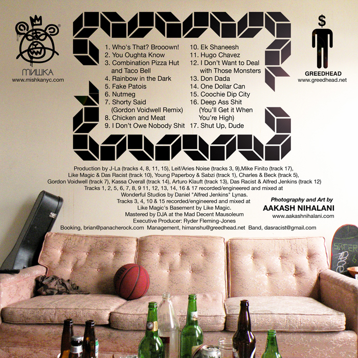 Das Racist dropped their first mixtape about two weeks ago via Mishka and Nah Right, and also in association with their self-owned label/management group Greedhead Entertainment. You can download it for free from either site, or here if you’re lazy. Here’s the cover art, designed by Aakash Nihalani: